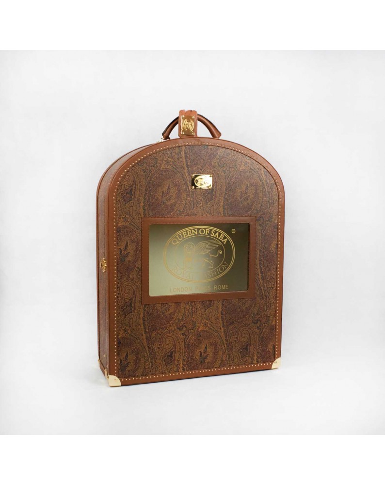 Esclusiva valigia della linea Paisley Collection, creato su richiesta per custodire la vostra preziosa pelliccia. Disponibile nelle tinte: Marrone Paisley, Rosa paisley, Bianco, è realizzato in materiale ecopelle con rifiniture e bordature eseguite a mano arricchite di particolari in oro lucido. Il rivestimento interno è disponibile ecopelle colore latte o bianco e provvisto di gancio di metallo per l’attaccapanni.